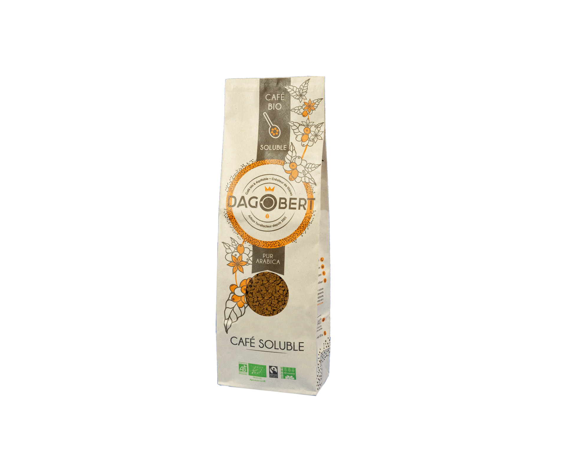 Un café Mexicain bio et équitable ! Torréfié et ensuite broyé, il est ensuite infusé à une certaine température pour obtenir un extrait de café. L’extrait circule dans un conduit dans lequel de l’air sec est injecté afin de transformer le liquide en une pâte solide contenant de la glace et du café. Dans la chambre froide, le broyage transforme la pâte en petites granules dont la taille sera préservée jusqu’au produit final. Le produit granulé est chargé dans des plateaux qui sont individuellement introduits dans le tunnel de lyophilisation, où la teneur en eau est sublimée.